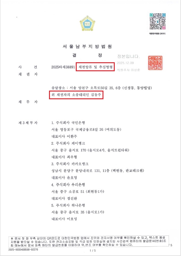 이에 A씨는 저희에게 사건을 위임하여 압류를 진행하기로 하였습니다. 저희는 압류 추심신청 이전에 신용조사를 통하여 주거래은행을 확인하였고 그 외에 재산상황 및 근로 상황에 대해서도 확인하였고, 금원이 있을만한 금융기관에 대해서만 압류 추심신청을 하여 인용되었습니다.