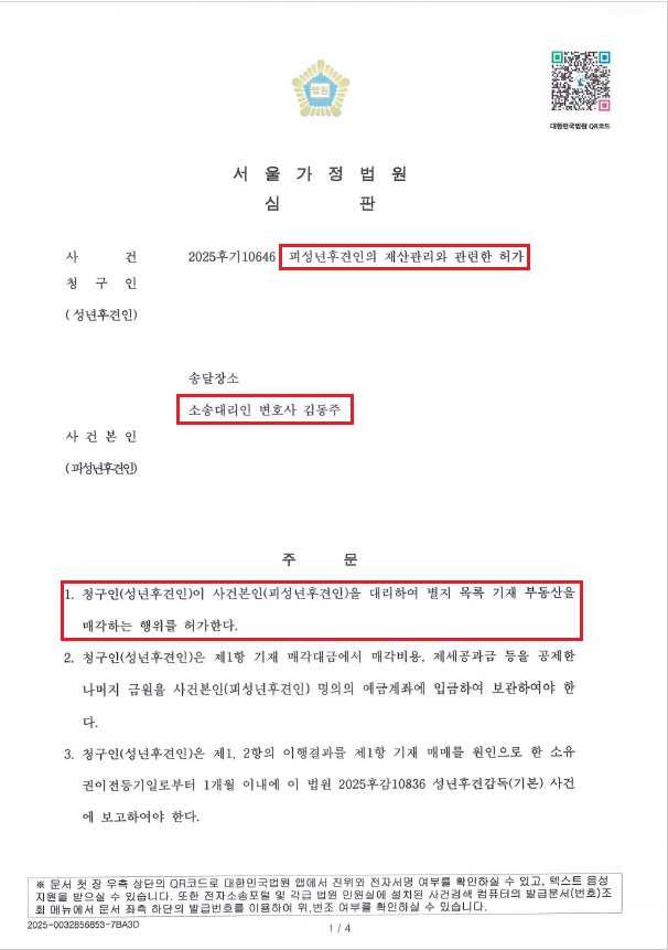 이후 큰어머니의 유일한 재산인 주택을 처분하기 위하여 법원에 허가를 받고자 신청하였고, 저희는 성년후견에 이어 이 사건을 위임받아 법원의 보정을 신속하게 소명하여 신청하고 6주 이내에 허가를 받게 되었습니다.