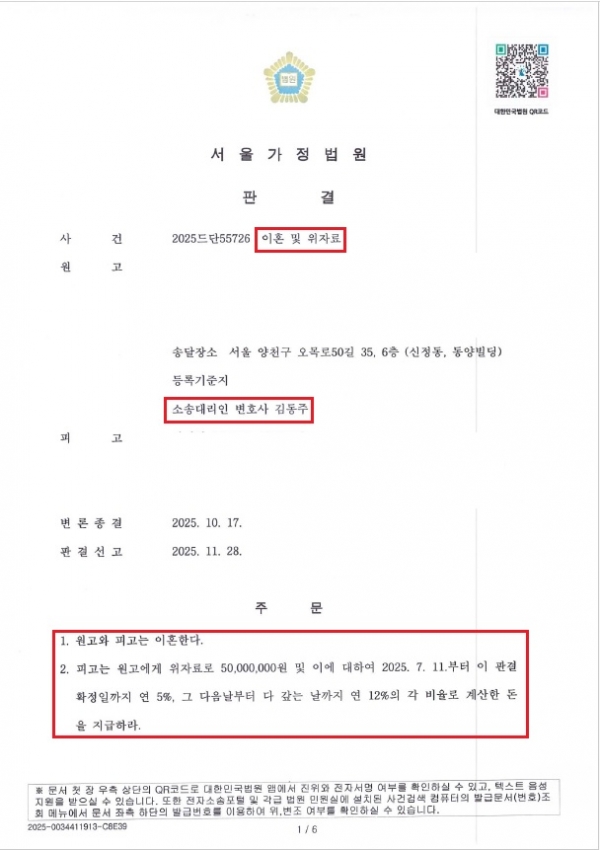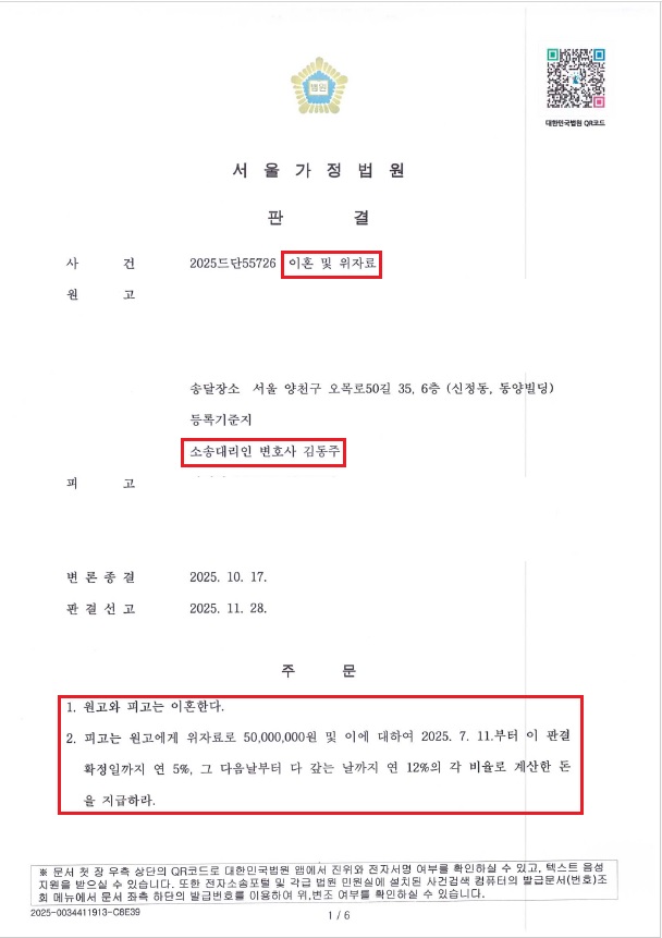B씨는 오히려 A씨가 자신을 무시하는 등 혼인관계를 유지할 수 없게 한 잘못이 있다고 주장하고, 이미 소멸시효가 지나 위자료 청구를 할 수 없다는 주장도 하였습니다. 저희는 이러한 부분에 대하여 적극적으로 반박하였고 결과적으로 위자료 5천만원 청구에 대하여 전부 승소할 수 있었습니다.