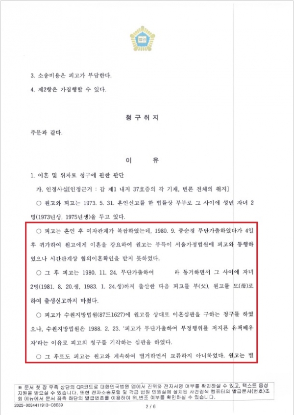 [가사] *성공사례* 배우자 부정행위 가출, 장기 별거하여 이혼, 위자료 5천만원 인정