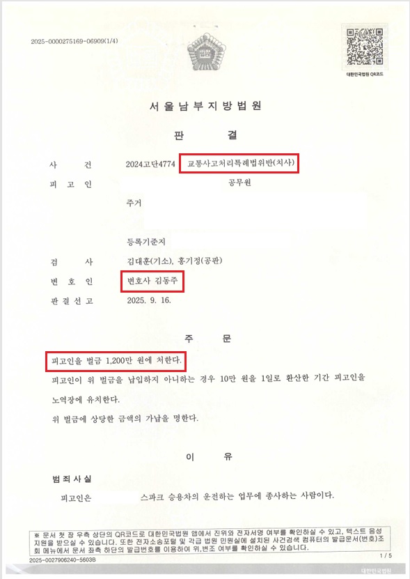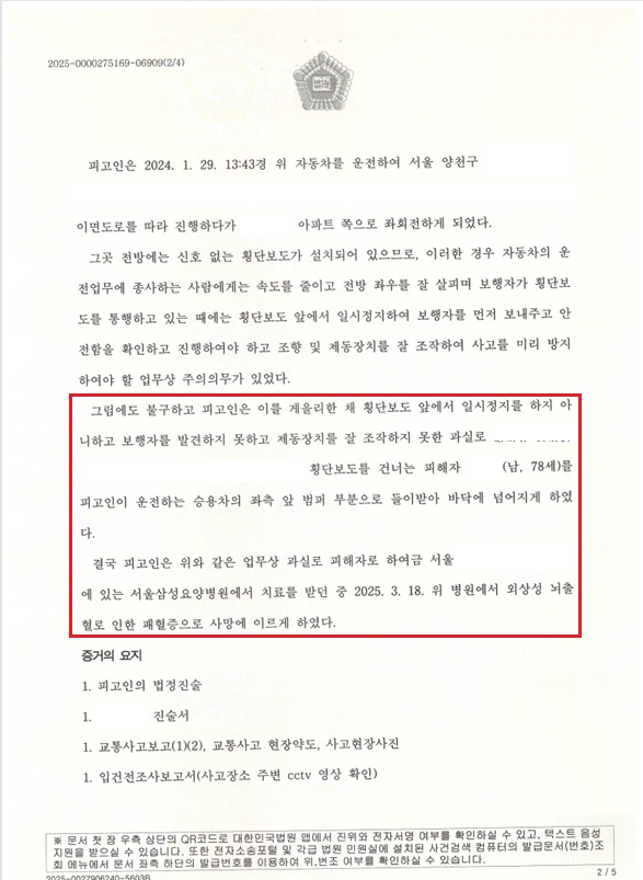 [형사] *성공사례* 횡단보도 교통사고 피해자 사망, 벌금형 선고