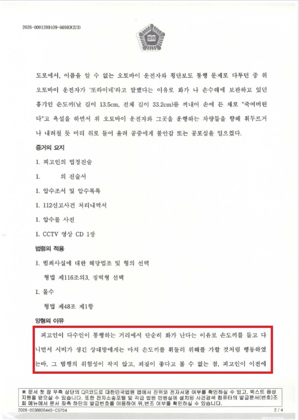 A씨는 오토바이 운전자와 횡단보도 통행 문제로 다투던 중 자신에게 욕설을 했다는 이유로 화가 나서 손수레에 보관하고 있던 손도끼를 꺼냈고, 욕설을 하면서 오토바이 운전자와 차량들을 향해 휘둘러 출동한 경찰에게 체포되었습니다. A씨는 이미 두 차례 같은 흉기를 이용하여 협박한 일로 처벌을 받은 바 있었습니다.