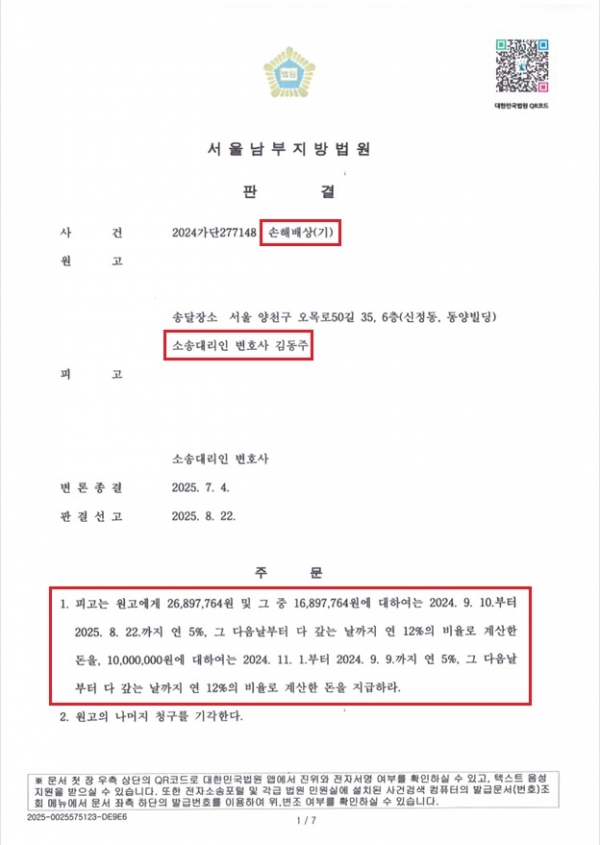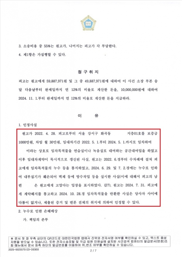 [민사] *성공사례* 누수 임대차계약해지 손해배상청구 인용