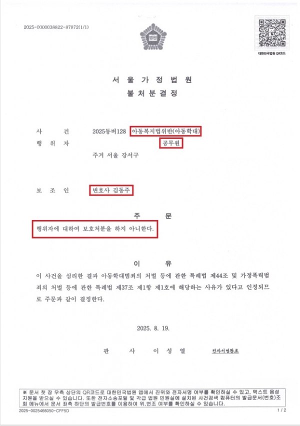 [형사] *성공사례* 공무원, 배우자에게 아동학대 고소당해 대응, 보호처분송치 이후 불처분결정