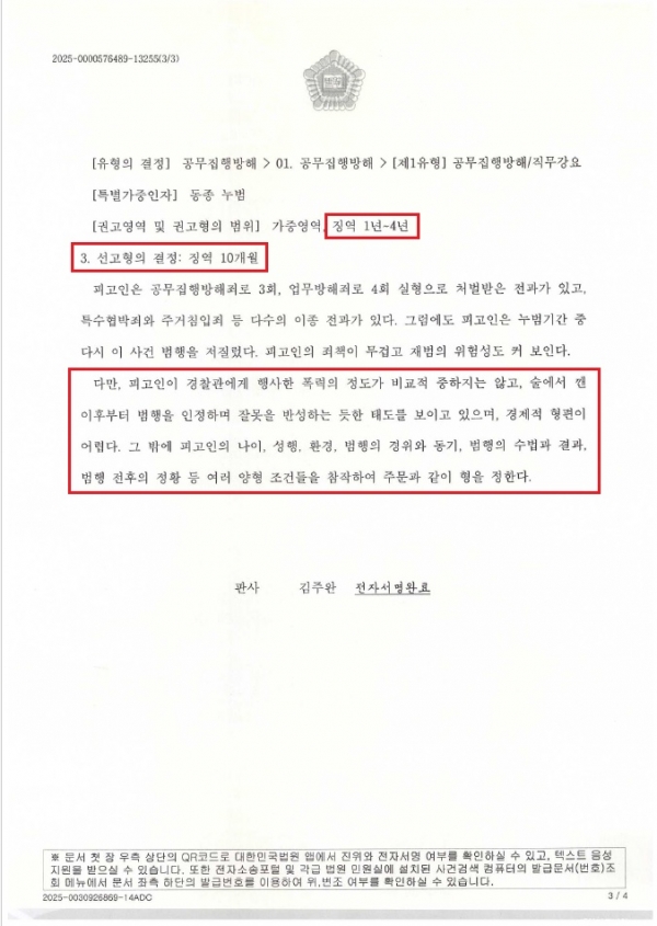 A씨는 이미 공무집행방해죄로 처벌을 받은 이력이 상당하고 출소하고 3개월 이내에 다시 공무집행방해죄를 저지르게 되었습니다. 술에 취한 상태에서 자신의 물건을 분식하였는데 경찰관이 이를 해결하기 위해 출동하였다고 오인한 상태였고, 이 과정에서 경찰관가 시비가 붙어 우발적으로 뺨을 치는 등 폭행하게 되었습니다.