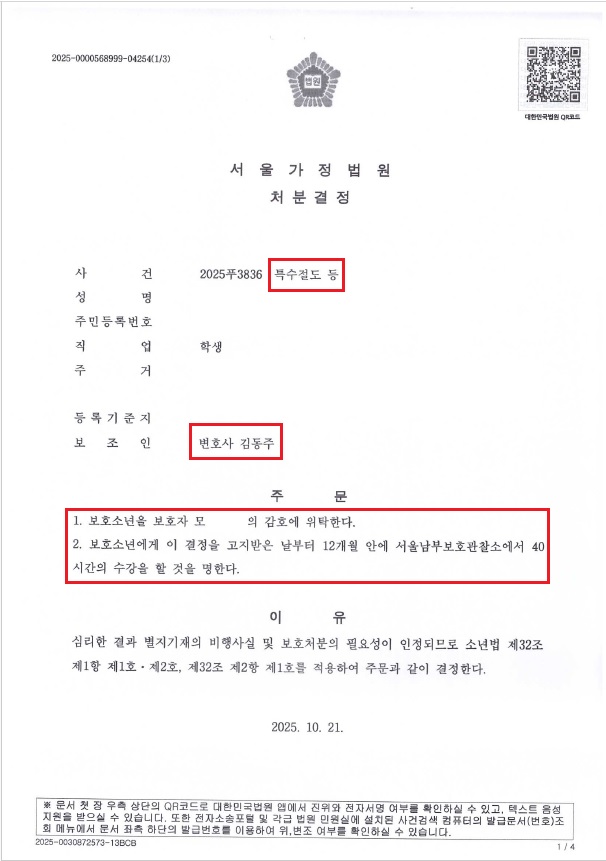 이 사건 소년보호사건 송치가 된 이후 사건을 위임받은 저희는 사건이 마무리될 때까지 매우 불안한 A군과 A군의 부모님의 정서적 안정 및 절차적 편의는 물론이며, 유리한 자료를 최대한 제출하고 경미한 처분으로 마무리될 수 있도록 조력하는 데 중점을 두었습니다.