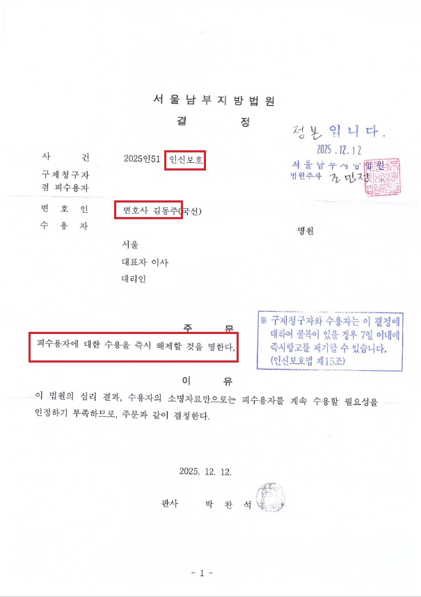 [형사] *성공사례* 인신보호사건 인용, 정신병원 강제입원(보호입원) 해제 결정 > 성공사례